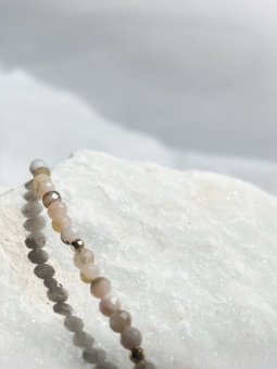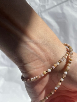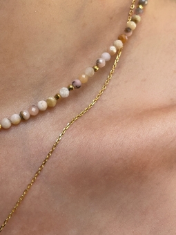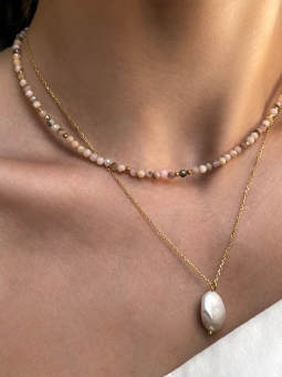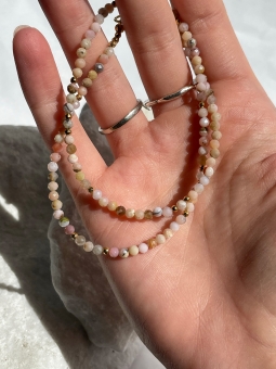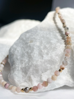 Choker z naturalnym różowym opalem i złotymi, ozdobnymi kuleczkami. Naszyjnik na żywo subtelnie błyska, dzięki fasetowanym kamieniom.